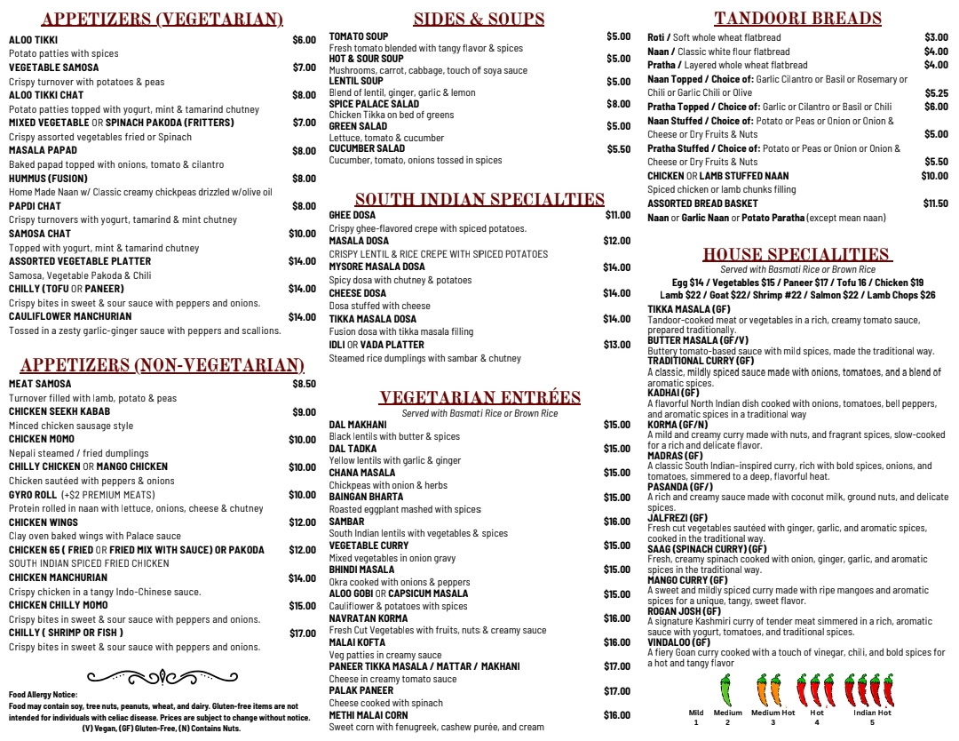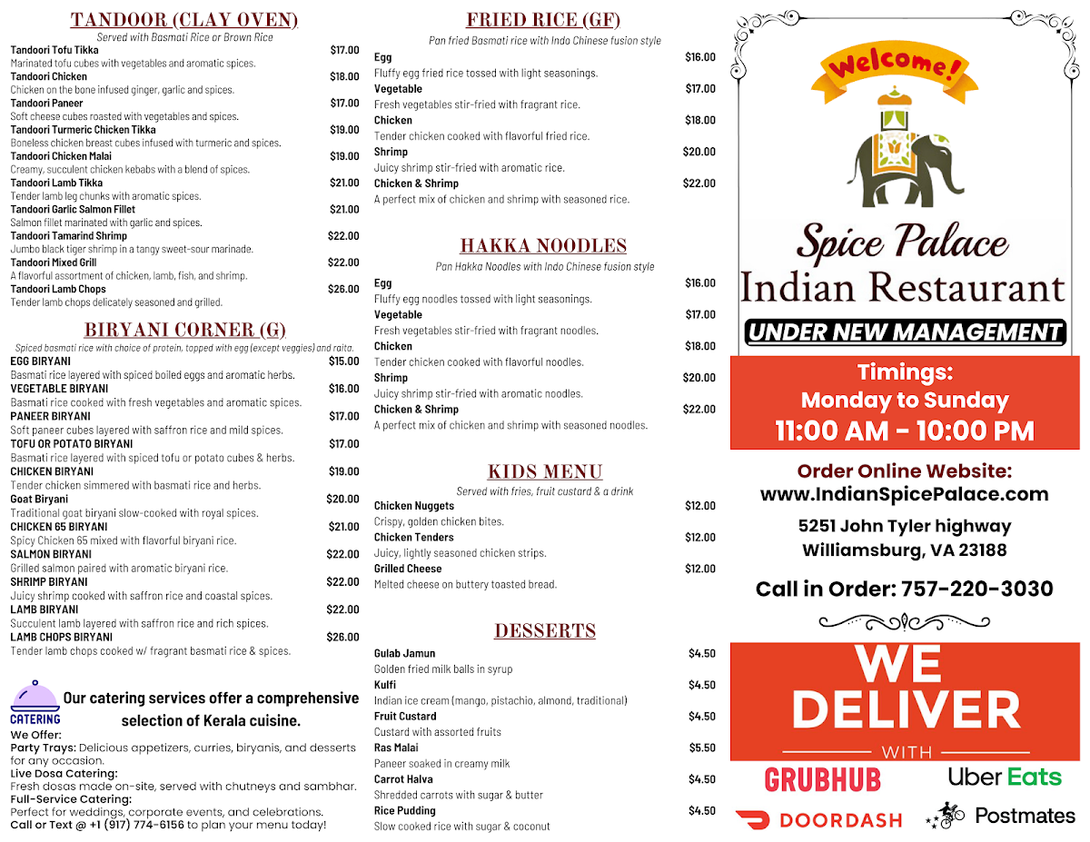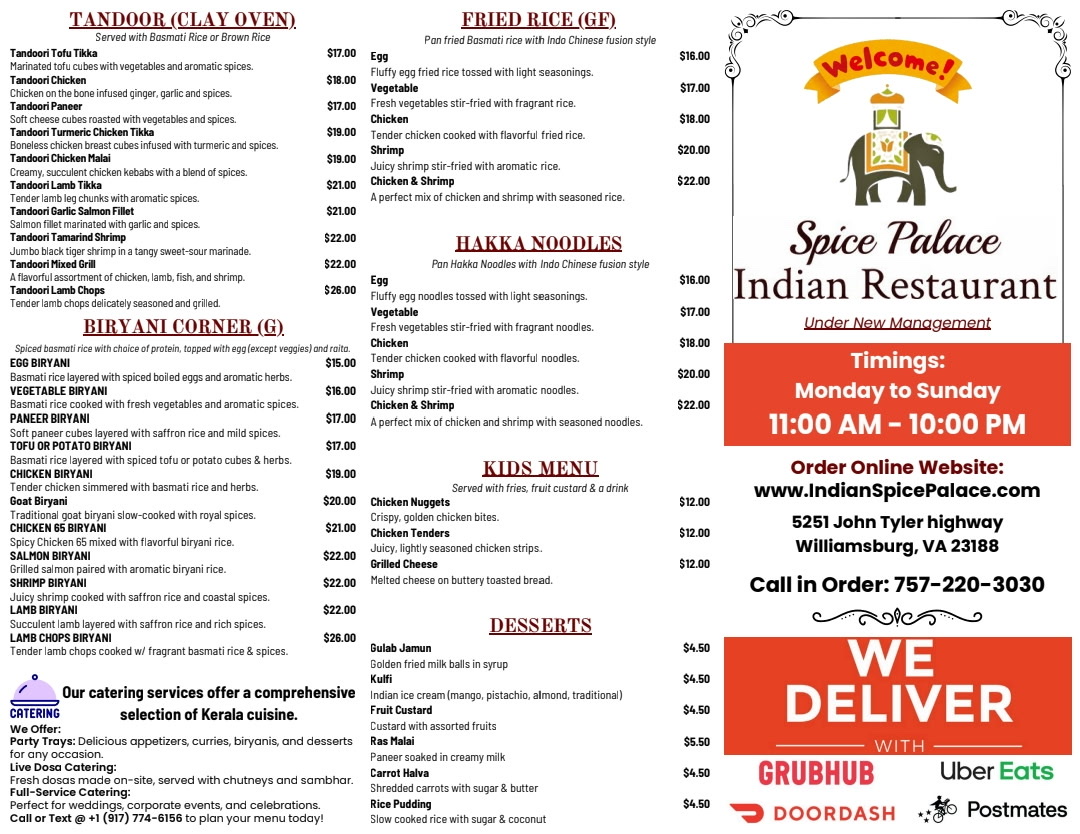 Whether you're dining with family, friends, or even the little ones (who can enjoy items like Kid's Chicken Tenders or Kid's Grilled Cheese), Spice Palace offers a comprehensive menu that ensures every guest has an exceptional dining experience.