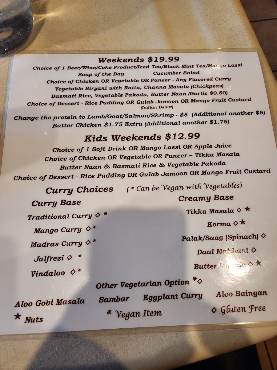 For a complete meal, explore the Biryani Corner, where you can savor fragrant dishes like Vegetable Biryani, Chicken Biryani, and the succulent Lamb Biryani. Don't forget to try the Thali options, whether you're after a Vegan & Gluten-Free Thali, a hearty Vegetarian Thali, or a filling Non-Vegetarian Thali.